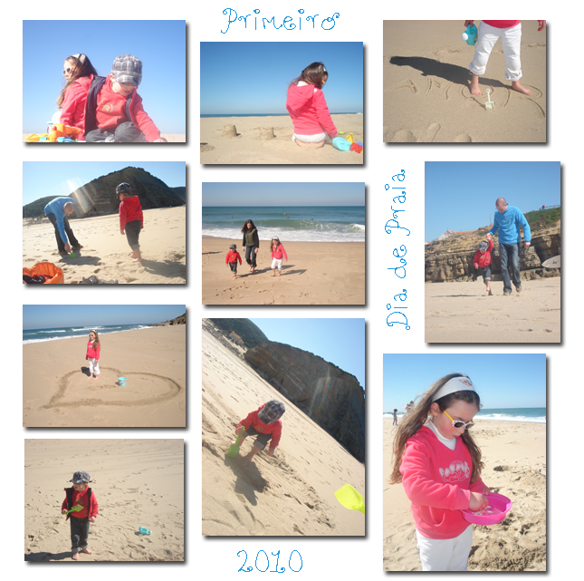 Hoje fomos à praia e fizemos castelos, molhamos os pés ( e as calças) , escrevemos na areia e apanhamos conchinhas. Devo confessar que este fim-de-semana foi mesmo em cheio! Estava mesmo a precisar deste maravilhoso sol. Poder respirar ar puro e fresco, correr e saltar.
