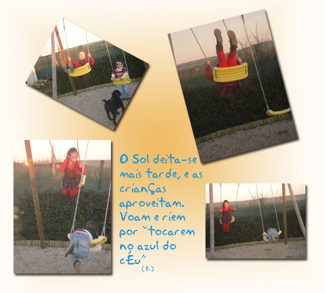 Enquanto o J. dorme a sesta a princesa aproveita sempre para voar um pouco mais alto. É das melhores sensações que podemos ter, sentir a velocidade de um baloiço, o subir e descer constante. A E. adora inclinar-se para trás enquanto se baloiça pois diz ter a sensação de tocar o céu! No outro dia à conta dos malabarismos deu uma cambalhota para trás!