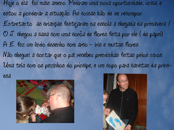 Não sei se num momento de pura loucura, ou de sobriedade em que tudo me pareceu simples e correcto. DEMITI-ME. O patrão ( meu Pai) começou a barafustar por uma ninharia, sem motivo, humilhou-me,fez-me sentir mal e eu...gritei, explodi e no Dia do Pai apresentei a minha carta de demissão. Por incrível que pareça na altura senti-me livre que nem um pássaro que saiu finalmente de sua gaiola.
