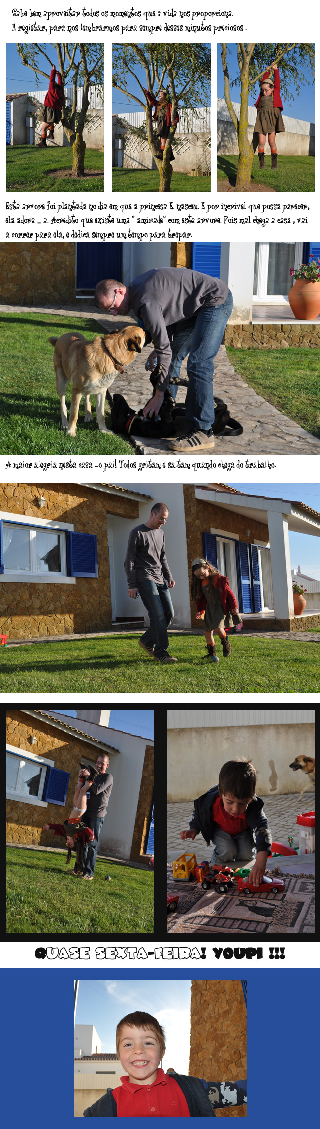 Depois quando fui buscar os ninos, perguntei à E. sobre o comportamento e a tagarelice. Ela diz que realmente há uns tantos meninos que se portam mal, mas que ela se porta sempre bem. Que a D. nunca a repreendeu. ( será???)Quando apanho a educadora na escola falo sempre, e vou sabendo e até agora não houve queixa a não ser de quando começa a falar não se cala , mas no intervalo e com a educadora! ( apanha cada seca da minha E.!!!).